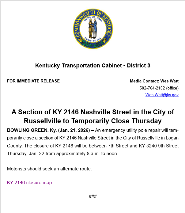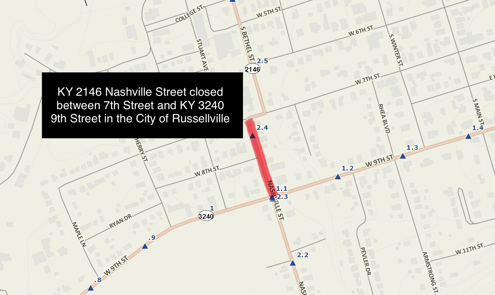 A Section of KY 2146 Nashville Street in the City of Russellville to Temporarily Close Thursday